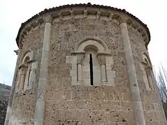 - Ábside románico con la cubierta de tejas la segoviana que se dividen en gajos y forman un tejado cónico.