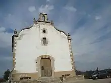 Una sencilla puerta de arco mixtilíneo con las dovelas superiores bicolores, enmarca una fachada encalada que presenta dos ventanas encima de la puerta, una rectangular y la otra ovalada. Este frontis está rematado por una cornisa mixtilínea con moldura, con jarras y pináculos, y coronado por una espadaña.[2][5]
