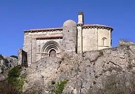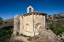 Construida en sillería arenisca, presenta una nave rectangular y su cabecera está compuesta por ábside semicircular y presbiterio recto.[2] Al lateral, un husillo de planta rectangular que se convierte en circular según asciende en altura; su función no está clara, pues cuenta con una escalera de caracol y también sugiere funciones defensivas.[3] El ábside se divide en tres paños, cada uno con una ventana. La ventana central cuenta con una arquivolta de medio punto, con decoración vegetal y guardapolvo, la cual descansa sobre columnas cuyos capiteles muestran grifos y harpías afrontadas. Por su parte, las ventanas laterales son sencillas. Bajo la cornisa presenta canecillos decorados con motivos geométricos, vegetales, animales y representaciones humanas.[4]