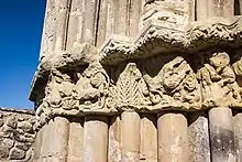 Sobre la jamba, la figura de San Miguel pesa un alma en la balanza, con el diablo aferrado a uno de los platillos. En el lado derecho, la jamba cuenta con una representación de las Tres Marías ante el sepulcro de Cristo, y en los capiteles se encuentran representados dos personajes que llevan un libro, un motivo vegetal, una pareja de harpías afrontadas, más motivos vegetales y dos personajes con manos alzadas. Por último, en el friso de la derecha, un grupo de nueve personas, que quizás representan algunos meses del calendario.[4]