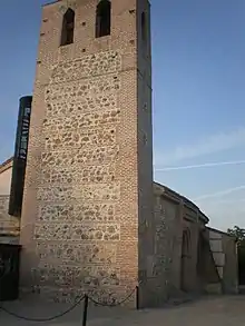 Uno de los elementos más singulares del conjunto es su torre, dada su reducida planta rectangular. Mide 5,70 m de largo, 2,25 m de ancho y 20 m de alto. Es maciza en su primer cuerpo y, en esta parte, presenta la misma fábrica que el cuerpo principal y la cabecera, aunque con variaciones, provenientes de las cajas de ladrillos instaladas en sus esquinales. Estas son desiguales en cuanto a tamaño y número.[3]