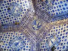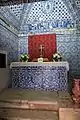 El techo piramidal está totalmente embaldosado y en el vértice tiene un calvario, coronada por una cruz de piedra.
