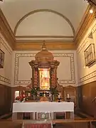 La planta del templo es de cruz latina con una nave con dos capillas a cada lado. El crucero tiene cúpula y en los pies hay un coro alto. La nave, el transepto y el presbiterio se cubren con bóveda de cañón, la nave con lunetos. La cabecera es plana con un templete realizado con piedra de Tortosa.