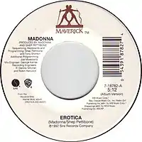 «Erotica» es una canción interpretada por la cantante estadounidense Madonna, incluida en su quinto álbum de estudio del mismo nombre. Las compañías Maverick, Sire y Warner Bros. Records la publicaron el 29 de septiembre de 1992 como el primer sencillo del disco, y figuró posteriormente en los grandes éxitos GHV2 (2001) y Celebration (2009). Compuesta y producida por Madonna y Shep Pettibone —con escritura adicional de Anthony Shimkin—, es un tema de género trip hop e incluye loops agudos y una voz susurrante de la cantante. Se destaca por emplear la técnica del spoken word o palabra hablada que se había introducido anteriormente en «Justify My Love» (1990). La artista adopta un alter ego llamado Dita, en homenaje a la actriz alemana Dita Parlo, y en la letra invita a su amante a asumir un rol sumiso a la vez que lo lleva a explorar los límites entre el dolor y el placer.