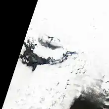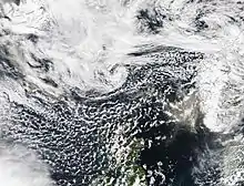 21 al 23 de mayo | ![]() Islandia es apenas visible en la extremidad noreste, donde la exploración ocasional revela la inyección de ceniza volcánica en el aire sobre las nubes del Ártico donde los vientos del este la llevan hacia Groenlandia, 21 al 23 de mayo. GOES-EAST | |