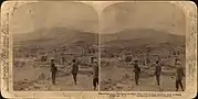 St. Pierre días después de la erupción en 1902, el monte Pelée al fondo semicubierto por neblina.