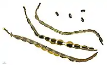 El fruto es una vaina o legumbre derecha, de color marrón oscuro, de 12 cm a 25 cm de largo por 1 cm de ancho, con un apéndice en el ápice y un tallo delgado en la base. En su interior contiene semillas de color marrón en forma de riñón, de 1 a 2 cm de largo. Sin embargo, el fruto es tóxico para el ganado, lo que restringe su uso.