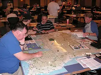 - Escala operacional: representa el enfrentamiento de unidades desde batallón a división. Normalmente se ocupa tan solo del aspecto militar, quedando la parte política o económica reflejada de forma abstracta mediante la obtención de refuerzos conforme a una secuencia histórica. Suele cubrir una sola campaña y la logística y el tiempo atmosférico pueden desempeñar un papel importante. Ejemplo: Hell's Highway de Victory Games.