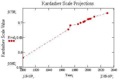 siendo K, el tipo de civilización de Kardashev y W la potencia aprovechada en vatios. Nótese que los numerales romanos deben ser utilizados para la parte entera del tipo de civilización, mientras que la parte fraccional se escribe en decimal. Sagan utilizó 10 teravatios (TW) como el valor de W de la humanidad para el año 1973, algo que fue ligeramente superior a la de los datos conocidos en la actualidad.[6]