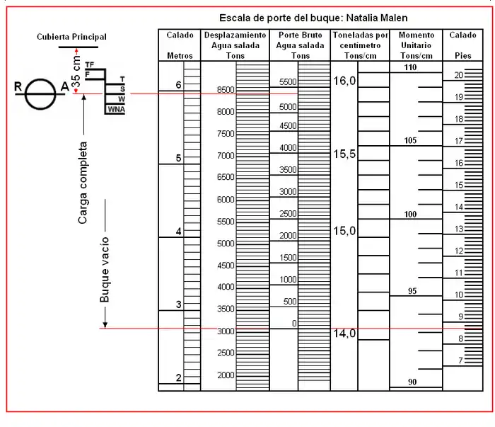La escala de porte (como la de la imagen), es suministrada por los astilleros a los propietarios para facilitar la siguiente conversión: