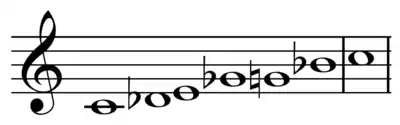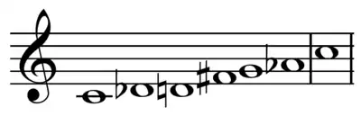 La escala tritono de dos semitonos, do re♭ re fa♯ sol la♭, es una escala simétrica que consiste en un patrón repetido de dos semitonos seguidos de una tercera mayor que ahora se utiliza para la improvisación y puede sustituir a cualquier modo de la escala menor de jazz.[11] La escala originada en el libro Thesaurus of Scales and Melodic Patterns de Nicolas Slonimsky mediante la «división igual de una octava en dos partes», dando lugar a un tritono y la «interpolación de dos notas», añadiendo los dos semitonos correspondientes después de las dos notas resultantes.[12]