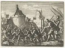 La cual (villa) comenzaron de batir, sin asestar la artillería y á escala vista tomaron el arrabal.