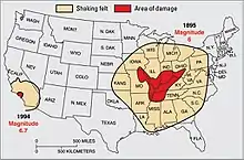 La intensidad se refiere a la fuerza de la sacudida en un lugar determinado, y puede estar relacionada con la velocidad máxima del terreno. Con un mapa isosísmico de las intensidades observadas (ver ilustración), la magnitud de un terremoto puede estimarse tanto a partir de la intensidad máxima observada (usualmente pero no siempre cerca del epicentro) como desde la extensión del área donde se sintió el terremoto.[2]