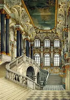 Una escalera imperial (a veces erróneamente denominada "escalera doble") es una escalera con tramos divididos, cuyo primer tramo asciende hasta un descansillo y luego se divide en dos tramos simétricos, ambos subiendo con el mismo número de pasos y girando al siguiente piso . Se dice que la función se utilizó por primera vez en El Escorial . [1] Uno de los ejemplos más grandiosos, el Escalier des Ambassadeurs en el Palacio de Versalles, fue construido en 1680 pero demolido en 1752 cuando el palacio fue reorganizado. La Escalera Jordan del Palacio de Invierno es un ejemplo notable, mientras que otras escaleras similares se pueden encontrar en el Palacio de Buckingham, el Castillo de Windsor, el Palacio Real de Caserta, el Palacio Real de Madrid y Torres Mentmore .