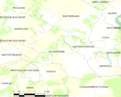 El pueblo está construido sobre un promontorio con vistas al valle de Save, en su margen derecha. Las comunidades cercanas son Mondilhan, Montbernard, Castera-Vignoles, Esparron, Cassagnabère-Tournas y Ciadoux.