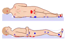 Las escaras pueden aparecer en zonas del cuerpo que sufren presión externa, sobre todo en la espalda, región sacra y talones, por lo que son características de enfermos encamados durante periodos prolongados. Cuando este tejido necrosado se cae o se extirpa deja una úlcera, que en este caso se denomina úlcera por presión o de decúbito.