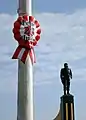 - Escarapela de plástico con la frase “¡Feliz 28 de Julio!” colgada en un poste al costado de la estatua de José Quiñones.