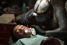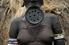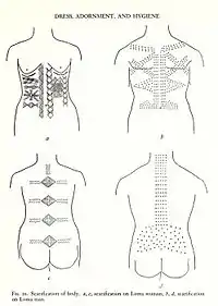 También se sabe que los maoríes y otras tribus de la República Democrática del Congo, Kenia, Nigeria, Sudán y Etiopía, emplearon esta técnica en sus rostros.[29] Como resultado, la piel quedaba literalmente esculpida con grandes diseños y protuberancias, sinónimo de belleza y valentía para las mujeres; también servía para identificar a los miembros de la comunidad.[30] Las primeras incisiones realizadas se rellenaban con pequeñas cantidades de ceniza, dando como resultado una cicatriz oscura.[31] Otras tribus oceánicas como la Sepik de Nueva Guinea se cortaban la piel en honor al cocodrilo, por tratarse de un animal sagrado.[32] Por lo general, los ancianos y las personas adultas que conforman este tipo de grupos se encargan de ejercer esta actividad y,[11] en ocasiones, ordenan a los demás (especialmente a los jóvenes) a iniciar con este rito ancestral, son conocidos como «maestros escarificadores» y conocen perfectamente los riesgos aunque se justifican en el hecho de que por medio de este método, los miembros de la comunidad podrán liberarse física y mentalmente, además de obtener otra serie de beneficios.[33] En algunas ocasiones, el artista o maestro que puede ser de la misma tribu o de otra diferente, recibe algunos beneficios como dinero o bebidas especiales. Esta remuneración varía pero puede ser de aproximadamente 500 Franco CFA que es la moneda oficial de 14 países africanos y dentro de las bebidas populares o especiales se encuentra el tchoukoutou que es un tipo de cerveza que se prepara con mijo o sorgo (sorghum bicolor).[34]