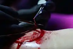 El cutting, también conocida como escarificación por cortes, es una de las técnicas más conocidas y empleadas junto al branding, en ella, es común el uso de cuchillas quirúrgicas aunque también se manejan navajas y otros objetos tales como espinas, vidrios, piedras y cáscaras de coco para realizar los cortes y trazados sobre la piel.[91] Sin embargo, los tatuadores profesionales y artistas del arte corporal sugieren el uso del escalpelo como una de las herramientas más fáciles de usar y que permite una mejor definición.[92] Por el contrario, las navajas no son recomendables, debido a que la mayoría presentan hojas ligeramente dentadas que dificultan el trazado y, por consiguiente, dejan cortes irregulares.[92] En ciertas ocasiones las heridas suelen ser tratadas con tintas, zumos de plantas, lodo, carbón molido, tierra colorada, cenizas y vinagre,[1] esto permite una mejor cicatrización; el uso de otros elementos como la sal o los condimentos hace que adquieran un mayor volumen.[93][94]