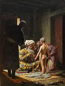La esclavitud era una parte legal y significativa de la economía y la sociedad del Imperio otomano.[28] Las principales fuentes de esclavos fueron cautivos de guerra y expediciones de esclavitud organizadas en África, Europa del Este y Circasia y Georgia en el Cáucaso. Se ha informado que el precio de venta de los esclavos cayó después de grandes operaciones militares.[29] La esclavitud de los europeos se prohibió a principios del siglo XIX, mientras que se permitía a los esclavos de otros grupos.[30]
