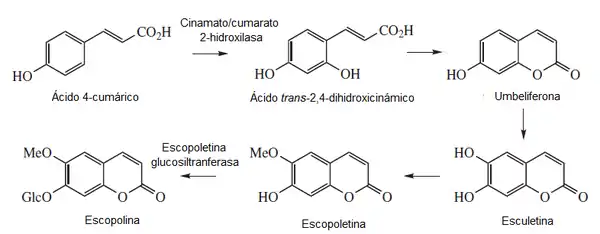 La escopolina es un glucósido de la escopoletina formada por la acción de la enzima escopoletina glucosiltransferasa.
