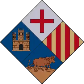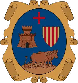Forma medieval en losange (...), con cuatro cuarteles: en jefe, en campo de plata, la cruz roja de Montesa y San Jorge de Alfama; abajo, a la izquierda [diestra heráldica], en campo de azur, el castillo al natural, a la derecha [siniestra heráldica], las armas reales, en campo de oro, cuatro palos de gules; al pie, en campo de azur, los toros con yugo que labran a la par, en color natural.