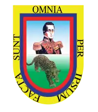 Escudo de forma española, orlado por la bandera de Colombia y dividido en dos campos: en el superior se encuentra la figura del general José María Córdova, y en el campo inferior aparece un jaguar, todas las figuras en sus colores naturales. Sobre la bordura el lema “OMNIA PER IPSUM FACTA SUNT” (Todas las cosas por él, fueron hechas)[2]