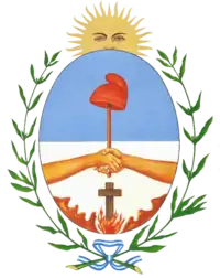 El escudo de armas de la Provincia está representado por una elipse trazada verticalmente y cortada en dos cuarteles por el eje menor de la misma. Los esmaltes de estos cuarteles, en la acepción heráldica, se caracteriza el superior; de azul ligero, y el inferior de plata. En parte inferior del cuartel de plata, surge y se yergue una cruz de sable incombustible, en un campo en llamas, rodeada por siete lenguas de tierra, -cuatro a la diestra y tres a la siniestra- En el Jefe del cuartel superior, se ostenta un gorro frigio de gules, inclinado a la diestra, en lo alto de una pica sostenida por dos manos diestras entrelazadas, desnudos los brazos respectivos que se elevan de los flancos del cuartel inferior, por encima de la cruz. | ||
