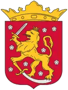 Blasón | En campo de gules sembrado de nueve rosas heráldicas de argén, un león rampante de oro, lampasado, armado y coronado de lo mismo con un brazo armado en su diestra blandiendo una espada de argén encabada de oro y que pisa una cimitarra de argén encabada de lo mismo. | |