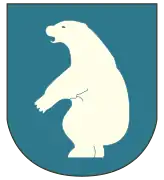 Blasón | En este escudo figura, en un campo de azur (azul), un oso polar rampante de plata (blanco) armado del mismo esmalte (color). | |