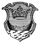 Sinisessä kentässä kultainen vene uimassa hopeisella, aaltokoroisella tyviöllä; veneen yläpuolella saatteena kultakruunu.