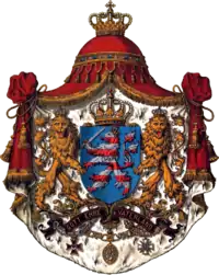 El Gran Ducado de Hesse fue un Estado monárquico alemán que se desarrolló entre 1806 y 1918, año en que fueron abolidas todas las monarquías en Alemania. El escudo de armas del Gran Ducado de Hesse en su forma concisa utilizaba las armas del propia ducado (en campo de azur, león rampante burelado de plata y gules), con la corona de un Gran Ducado y dos leones como soportes.