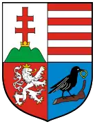 El escudo es partido: 1º fajado de ocho piezas de gules y plata; 2º, de gules, un monte de tres peñas de sinople moviente de la punta sumada de un coronel de oro del cual sale una cruz patriarcal de plata. Al timbre corona del rey San Esteban.