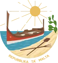 Este escudo de armas fue aprobado el 11 de julio de 1975, un año después de Malta se convirtiera en una república. Se mostró una escena costera con el sol naciente, un barco maltés tradicional (el "Luzzu"), unos remos y una chumbera. Todos estos símbolos son algo relacionados con Malta. Debajo de la imagen aparecía escrito el nuevo nombre del Estado: "Repubblika Ta 'Malta" (República de Malta).