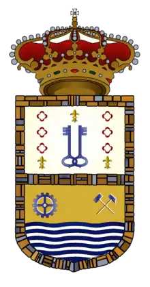 Escudo cortado. En la partición superior, sobre campo de plata, las armas de la familia Bernaldo de Quirós: dos llaves de azur enlazadas por los anillos, con tres luneles en cada flanco y tres flores de lis. En la partición inferior, maza y martillo de azur y plata colocados en aspa, rueda dentada de azur y ondas de agua en la punta, todo ello sobre campo de oro. Al timbre, corona real cerrada.