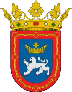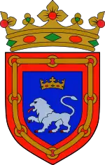 Blasón | «En campo de azur, león pasante de plata, lampasado y armado de gules y surmontado, al centro, por corona real de oro. En bordura lleva las armas de Navarra, cadenas de oro sobre gules.» | |