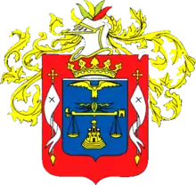Un escudo dentro del cual (hay) en lo alto unas nubes con unos rayos de fuego que entre medias de las dichas nubes salgan unas alas de una ángel de oro y dellas salga una mano de carne que tenga un peso con sus balanzas todo de oro y entre medias de dicho peso un castillo de oro con sus puertas y ventanas de azul y dos letras que dicen Sant Miguel, todo de dicho en campo azul y na orla con una corona de dicho (metal) y en lo alto de dicha orla y en los lados de dos cruces con dos vanderas revueltas a unas varas de lanza con un yerro de oro y en cada una hasta de lanzas y las vanderas de color de plata o blancas con cruces coloradas en ellas en campo colorado.