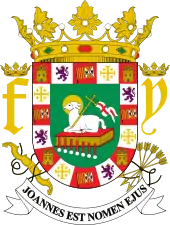Sobre el jefe se encuentra una corona real, abierta, en señal de la autoridad y jurisdicción de quienes otorgaron el escudo en 1511. En la parte izquierda aparece la inicial "F" de Fernando el Católico, rey de Aragón y Sicilia, y a la derecha "Y", inicial de Ysabel (Isabel la Católica).[2] Bajo las iniciales aparecen el yugo y las flechas, también símbolos personales de los Reyes Católicos.[2] En la punta se encuentra inscrito en latín el lema "Joannes Est Nomen Ejus" que significa "Juan es su nombre", una cita de la Vulgata del Evangelio según San Lucas (1:63).