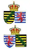 § 1 (1) El escudo de armas menor del Estado Libre de Sajonia muestra un escudo curvo de nueve franjas negras y de oro, con una corona-ruda verde en curva.Prof. Dr. Kurt Biedenkopf (Ministro Presidente), Steffen Heitmann (Ministro del Justicia del Estado Ley relativa al escudo de armas del Estado Libre de Sajonia de 18 de noviembre de 1991, (Ley y Boletín Oficial Sajoón de 1991, p. 383-385), Dresde, 18 de noviembre de 1991.[3]