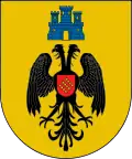 «Escudo en losange de ángulos rectos: de azur, una águila bicéfala coronada de sable cargando en el pecho un escudete de gules con 3 pajas de oro puestas en banda, y superada de un castillo de oro abierto. Al timbre, una corona mural de villa.»