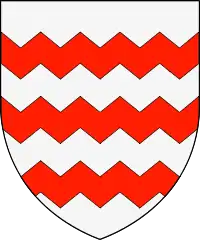 «Escudo en losange de ángulos rectos: de plata, tres fajas vibradas de gules. Al timbre, una corona mural de villa.»