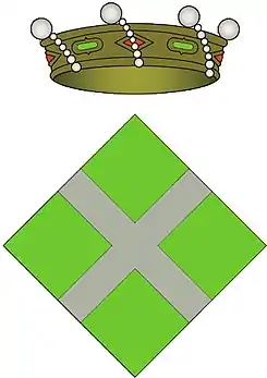 «Escudo embaldosado: de sinople, un aspa llena o cruz de Santa Eulàlia de plata. Al timbre, una corona de barón.»[1]