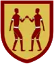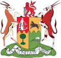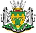 De oro y con filiera de ocre, dos figuras humanas San de ocre rojo, en pie de forma respetuosa, con las manos de los brazos más próximos estrechadas, con la parte superior del brazo, la muñeca interior, las bandas de cintura y rodillas de plata; el escudo sumado de una lanza y knobkierie en salterio, de sable. Por encima, un pájaro secretario exployado de oro, sobre una representación estilizada de una flor de protea con pétalos exteriores de sinople y los pétalos internos de oro y cargado en el pecho con un triángulo sembrado de nueve triángulos unidos en tres filas, el triángulo superior de gules, la segunda fila sinople-oro (invertido)-sinople, y la tercera fila sinople-oro (invertido)-sable-oro (invertido)-sinople. Sobre el pájaro secretario, un arco de siete rayos con facetas de oro y orange, con los dos rayos exteriores uniéndose al extremo de las alas. | |