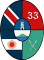 "óvalo dividido en cuatro cuarteles y en el centro, un segundo óvalo con dos cuarteles. En el cuartel superior izquierdo, sobre campo azul de prusia, una bandera formada por dos franjas blancas y una roja colocada en el centro, diagonalmente: en el de la derecha, sobre campo bermellón, la cifra 33. en blanco, en el cuartel inferior izquierdo, una bandera formada por dos franjas azules y una blanca, en el centro, en la cual hay un sol rojo; en el de la derecha, sobre campo verde mar, dos alfanjes cruzados. En el óvalo central, en el cuartel superior, una torre, en campo azul cobalto; en el inferior, un cerro"