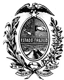 Blasón | En óvalo (Eclesiástico o de Damas). en diestra de argén, rayo en forma fulgurante de zig-zag, de cuyo extremo inferior nace una pluma extendida; en siniestra de dorado o amarillo, dos manos enlazadas, de mangas azul y rojo respectivamente. En la faja ancha dorada, se lee, horizontalmente, el nombre "Estado Trujillo", en letras de color blanco. Cuartel inferior de gules, una colina en sinople, sobre ella dos sables cruzados. | |