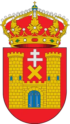 Blasón | En campo de gules, un castillo con dos torres de oro, almenado, aclarado de azur y mazonado de sable, en cuya puerta y en cada una de sus hojas, figura una llave de plata, puesta en palo. El castillo está surmontado por un aspa o sotuer de oro, y este a su vez, por una cruz patriarcal de plata. | |
