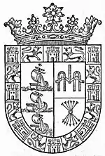 "Que tenga por armas un escudo el campo dorado y en la mitad del a la mano derecha un yugo y un manojo de flechas pardillo todo con los cascos azules y plumas plateadas lo cual es la divisa de los católicos Rey e Reyna nros. padres e abuelos e señores que ayan tanta gloria y en la otra mitad dos caravelas por señal que esperamos en nro señor que por alli se ha de hacer el descobrimiento de la especeria y encima dellas una estrella en señal del polo antartico y por orla de dho. escudo castillos y leones en un escudo a tal como este. ".Real Cédula, dada en Burgos, el quince de septiembre de mil quinientos veinte uno.