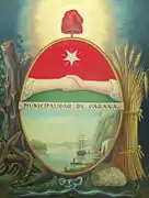 La parte superior está separada de la inferior en el oval del Escudo, con un lazo blanco llevando la inscripción Municipalidad de Paraná.