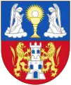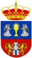 "Un escudo cortado: 1º de azur, un cáliz de oro, sumado de la Sagrada Forma de plata, radiante de oro, y acostado de dos ángeles en adoración afrontados, de plata, sobre sendas nubes del mismo metal, 2°, de gules, una torre donjonada de una pieza, de plata, aclarada de azur, y acostada de dos leones afrontados y rampantes contra la torre, de oro. Al timbre, corona real, forrada de gules, o rojo, cerrada, que es un círculo de oro, engastado de piedras preciosas, compuesto de ocho florones de hojas de acanto, visibles cinco, interpoladas de perlas y de cada una de sus hojas salen cinco diademas sumadas de perlas que convergen en un mundo azur, con el semimeridiano y el ecuador de oro, sumado de cruz de oro."