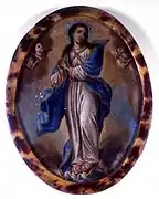 Los escudos eran pintados al óleo, ordinariamente, sobre placas redondas u ovaladas de cobre, con un marco que bordeaba la imagen principal, en el cual se colocaban imágenes de flores u otros motivos de ornato.